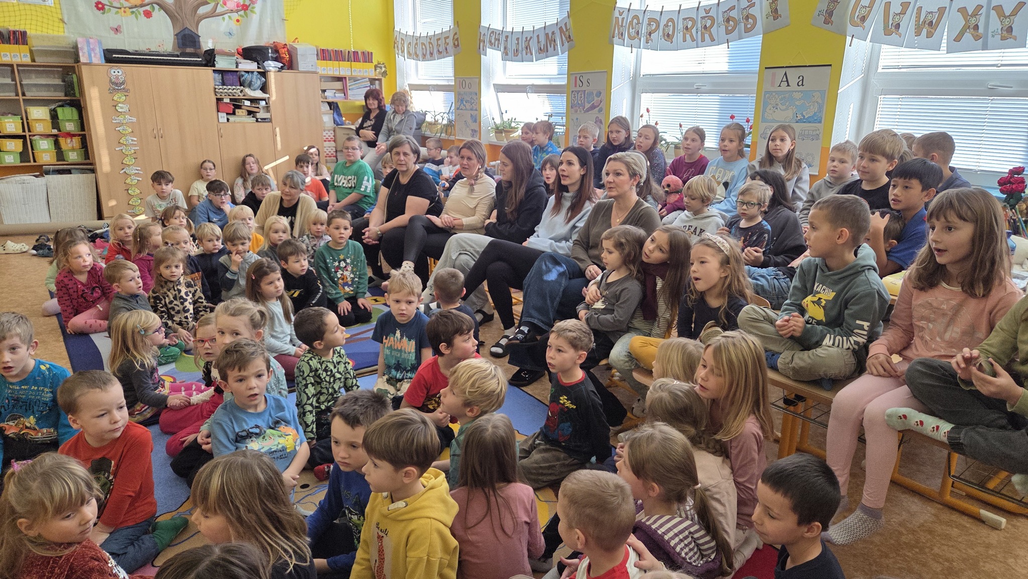 Děti ze školky zavítají ke školákům, školáci se navzájem všichni vidí a zpěv - ten přináší nejen dobrou náladu, ale nese i těšení se na blížící se Vánoce.